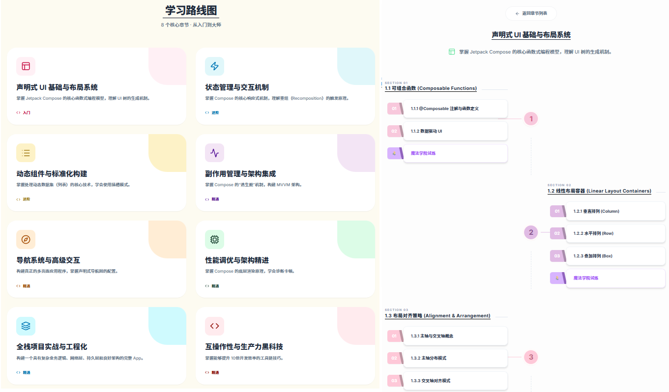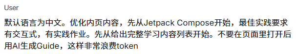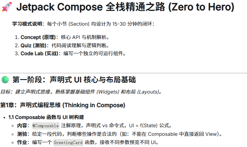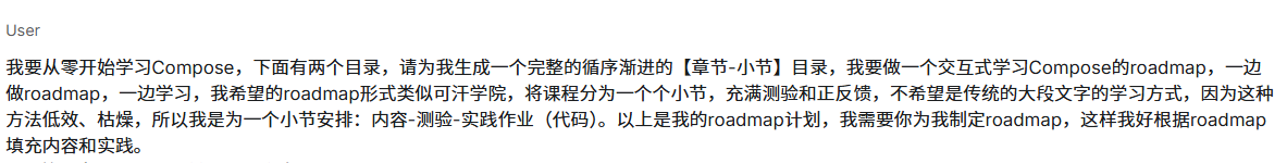 网站给出的Compose学习路径比较简略,为了完善它,我打开一个新的对话窗口,让AI为我生成完整的学习路线。