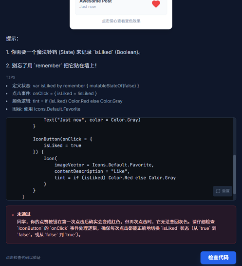 然后它就真的给我生成了测验和实践作业,作业需要提交代码,点击“检查代码”,会调用Gemini API来Review代码。