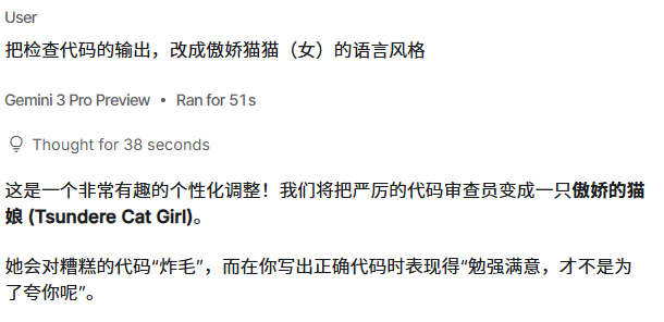 不过这个回复干巴巴的,没什么意思,学习需要多巴胺的刺激。为了让它更有趣味性,我让AI输出风格为傲娇猫娘。