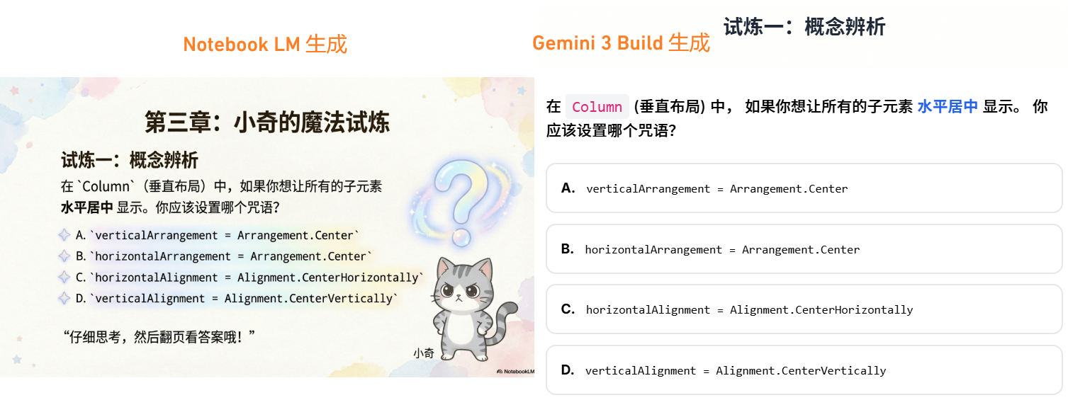 区别就是,在Notebook里的测试,还是枯燥的学习模式,而在Gemini 3 Build,你可以让它生成交互式的游戏,把测验嵌入到里面。