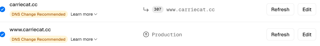 原因就在于Cloudflare,我之前在Cloudflare的DNS里添加了域名,开启了代理模式,所以把代理模式的小黄云关闭,手动修改www 记录的Target值为cname.vercel-dns.com,再把记录里域名那一项的IPV4地址改成76.76.21.21,Vercel 的官方固定 IP。