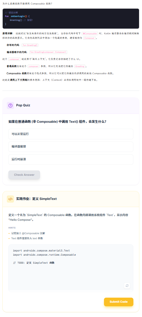 这是一个完整的包含Makdown知识点、小测验和代码实践的内容界面。