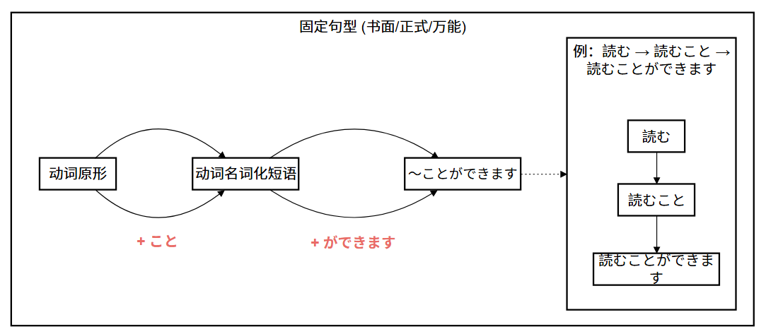 - ~ことができます 一个万能句型,接在动词原形后,同样表示“能够做某事”。比可能形更正式。