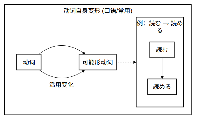 - 可能形 动词的一种活用形态,表示主语具有进行该动作的能力或条件。